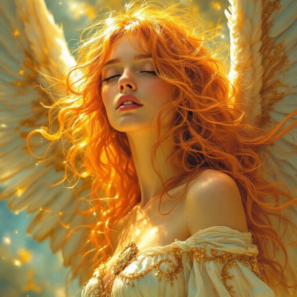 A striking picture of an angel with flowing orange hair and a serene expression. The image is rich with intricate details and bathed in warm golden light, reminiscent of art nouveau.