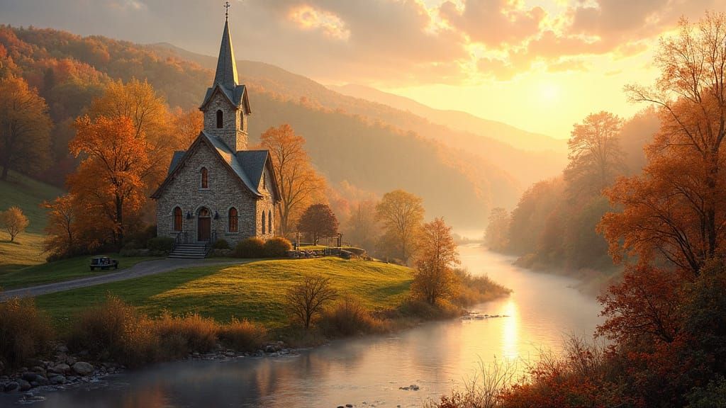 A peaceful autumn scene with a quaint village, church, and river bathed in warm golden hour light. Features soft, blended colors and detailed matte painting style.
