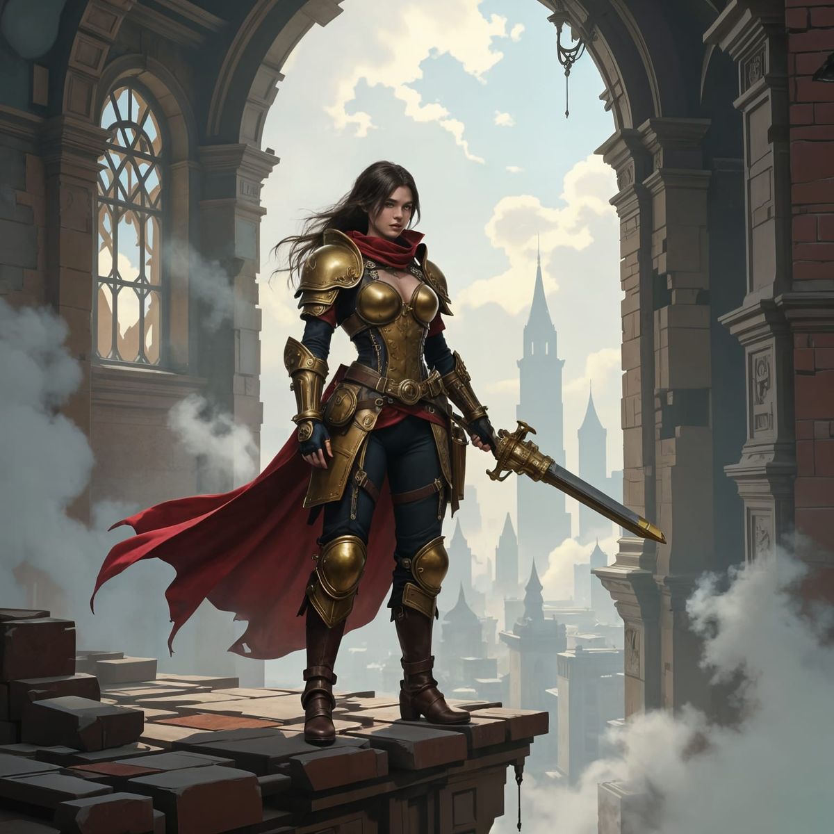 A lone fighter in detailed steampunk armor stands on a damaged bridge over a hazy city. Features dramatic lighting and rich oil painting textures, akin to fantasy game art.