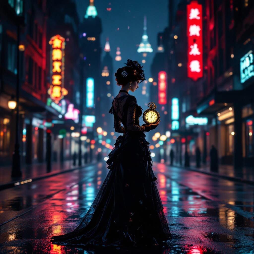 A lone Victorian lady with an intricate, lace-trimmed gown stands on a deserted, rain-slicked city street at midnight. Neon signs from tower...