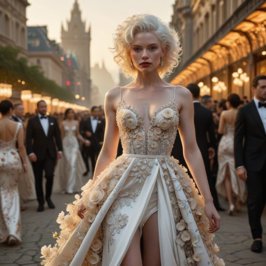 A digital image showing a woman with curly hair wearing an elaborate gown amidst resin wire art flowers. The scene is set during a mountain sunrise, creating a modern, eye-catching aesthetic.