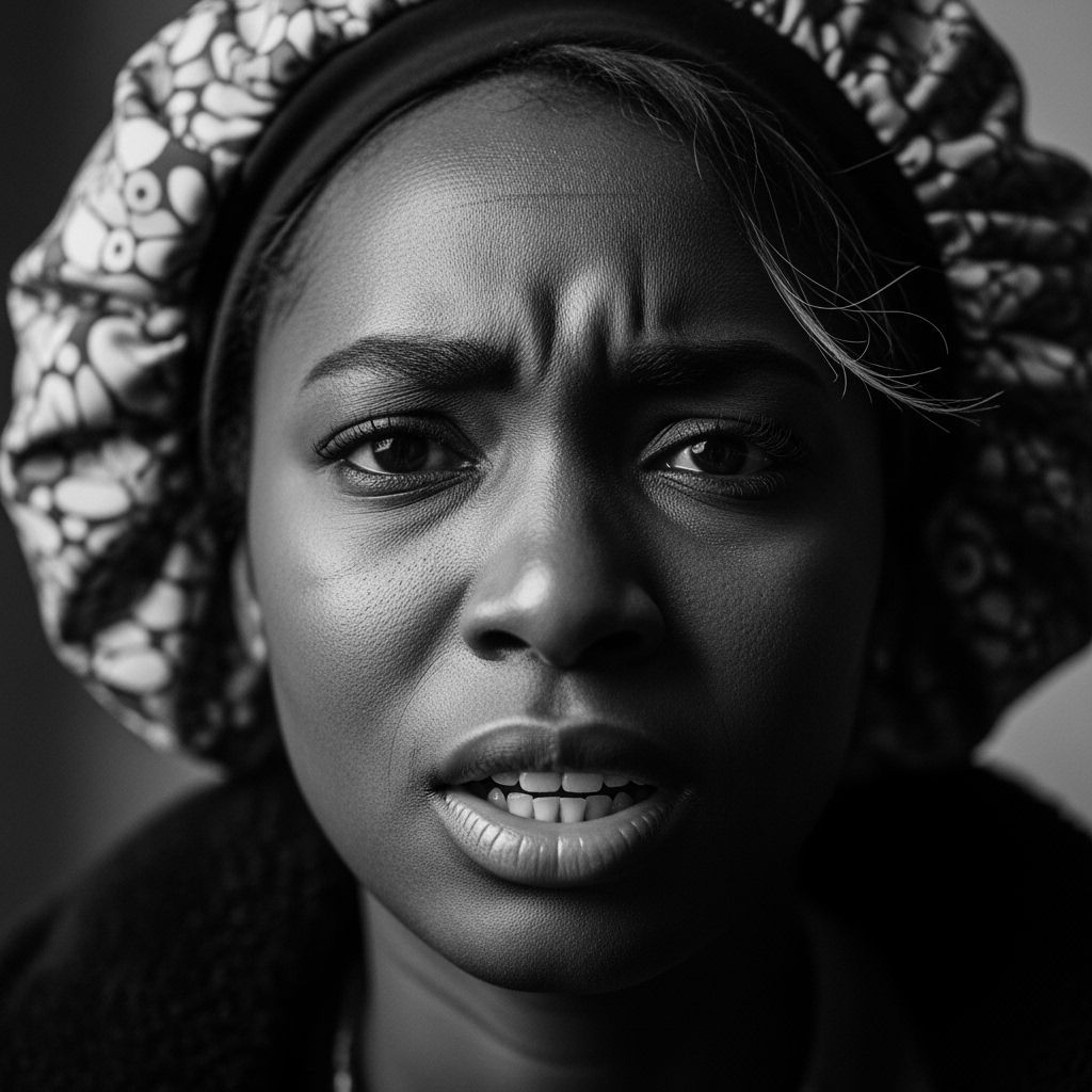 This image shows a close-up portrait of a Black woman in a bonnet with an upset expression. The soft lighting and intimate details evoke the style of emotive street portraits.