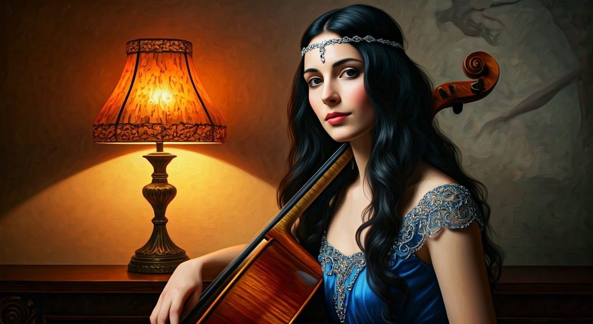 This image shows a serene woman playing the cello in a lavish setting, surrounded by opulent golden accents and rich textures, evoking a bygone era's grandeur and warmth.