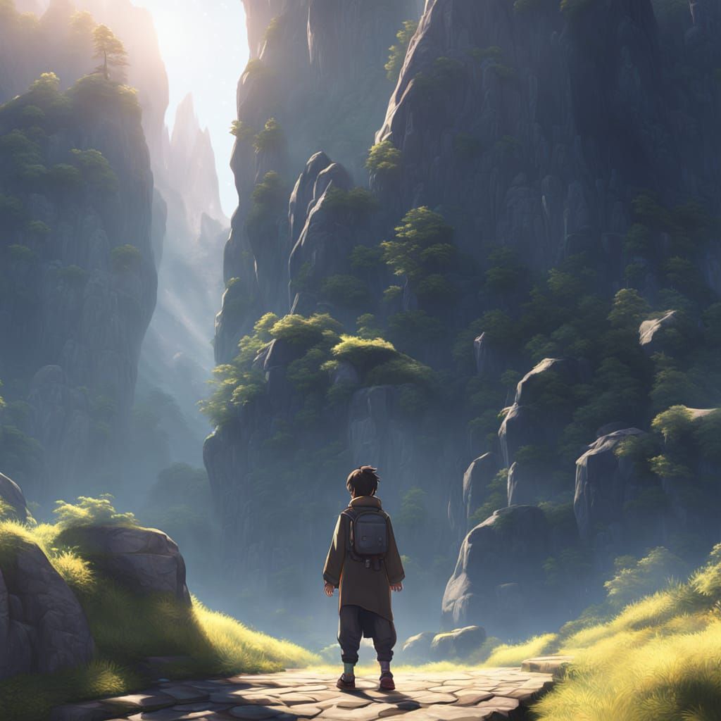 A 3D anime-style image of a man with raised hands standing between two mountains. The vibrant colors and soft lighting create a dreamy, fantasy landscape with glowing runes and mist.