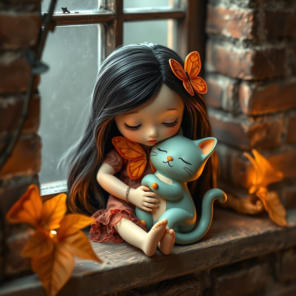 A charming image shows a dark-haired doll asleep, embracing a bluish-green cat figurine. The scene is bathed in warm, golden light, creating a dreamy and whimsical atmosphere, reminiscent of surrealist art.