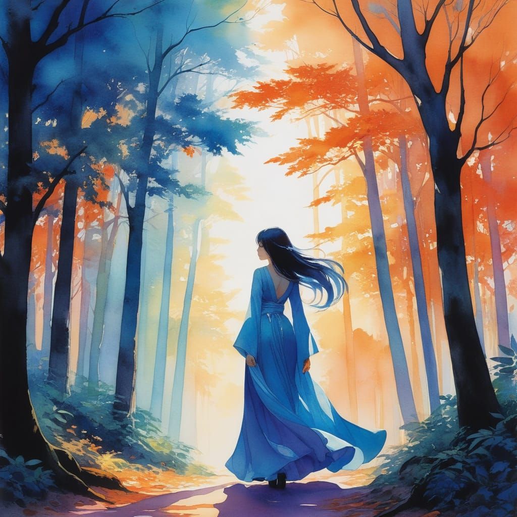 This watercolor anime image captures a mystical entity in a serene pose, surrounded by a lush forest with vibrant colors and intricate details, reminiscent of 90s anime art.