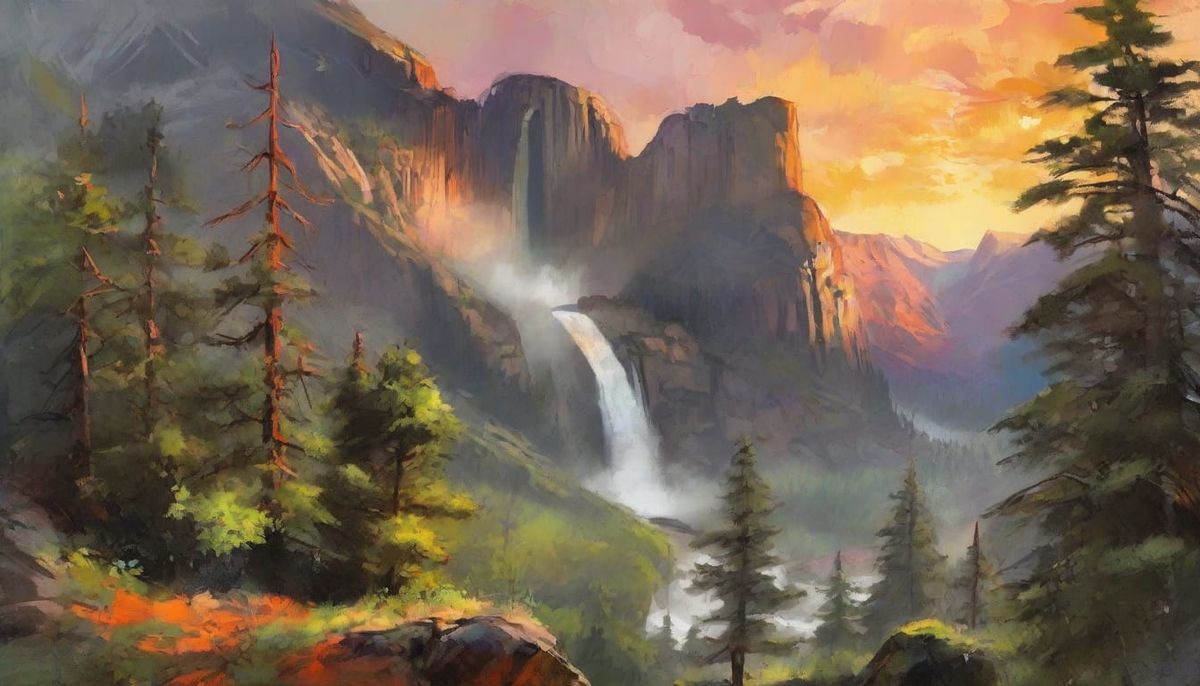 #deep-valley#waterfalls#misty#tall-pines#sunset