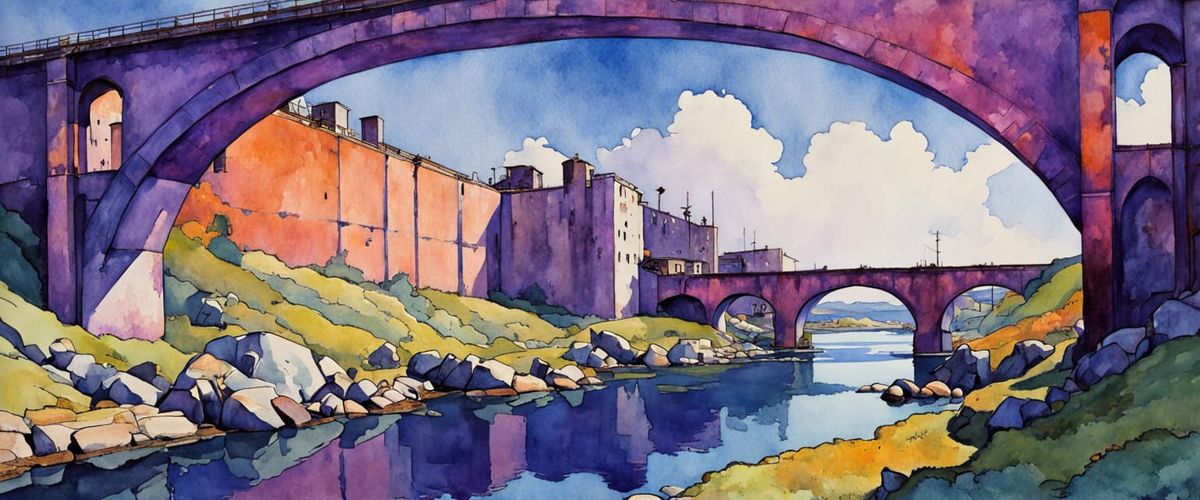 A vivid watercolor painting of an industrial wasteland featuring an arched bridge under a clear blue sky. Impressionist techniques, volumetric lighting, and a chiaroscuro effect enhance the scene.