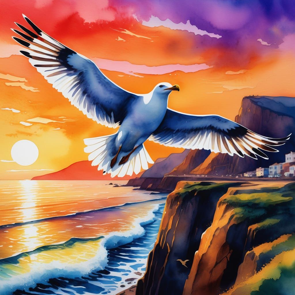 A watercolor painting of a seagull in flight over the ocean near a cliff during sunset. The image features vibrant colors, high contrast, and textures reminiscent of street art.