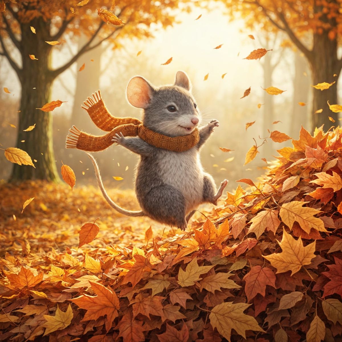 A heartwarming children's book illustration of a fluffy mouse in a scarf joyfully jumping into a pile of colorful autumn leaves, bathed in warm, golden light.