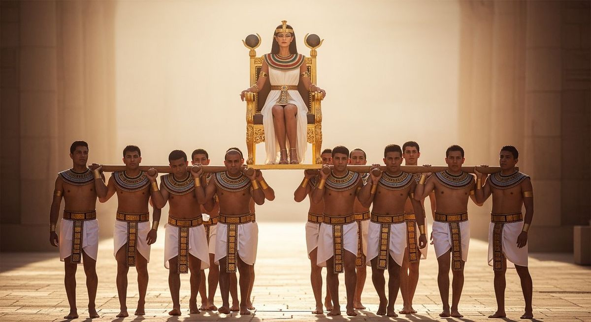 This image shows an Egyptian queen being carried on a golden throne by twelve servants. Shot with professional photography techniques, the sun-kissed scene is rendered with creamy bokeh.