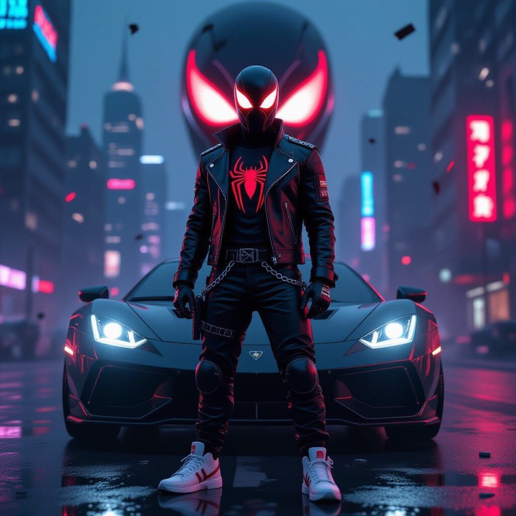 This image shows a cyberpunk hero in a spider-themed suit, standing by a sleek sports car. A neon city skyline and a giant hero face fill the background, rendered in ultra-realistic digital art.