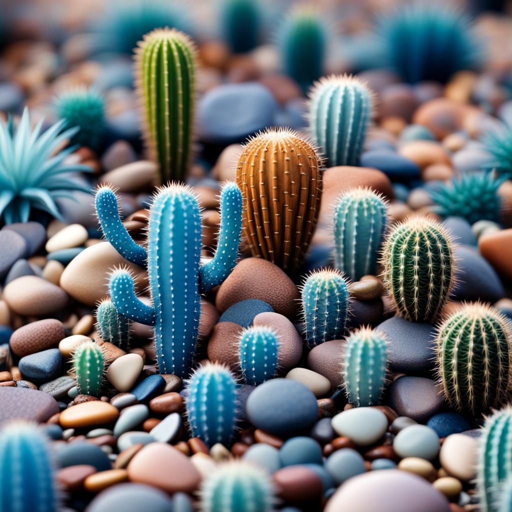 This image shows blue cacti of various shapes and sizes growing amongst colorful pebbles. The scene is set in a steampunk-inspired world, rendered in a digital art style.