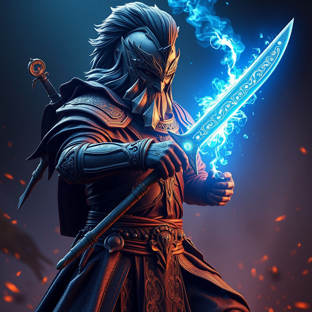 A powerful warrior wielding a magical sword crackling with electric energy. The scene is a vibrant display of clashing colors rendered as a high-resolution digital sculpture.