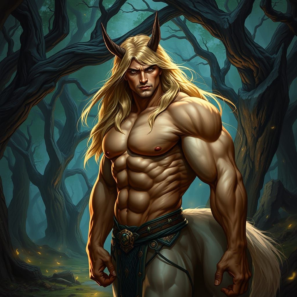 A hyperrealistic image shows a muscular centaur in a firefly-lit grove. Ancient trees twist around him in this dramatic scene with deep color depth. The image evokes romanticism and dark fantasy art.
