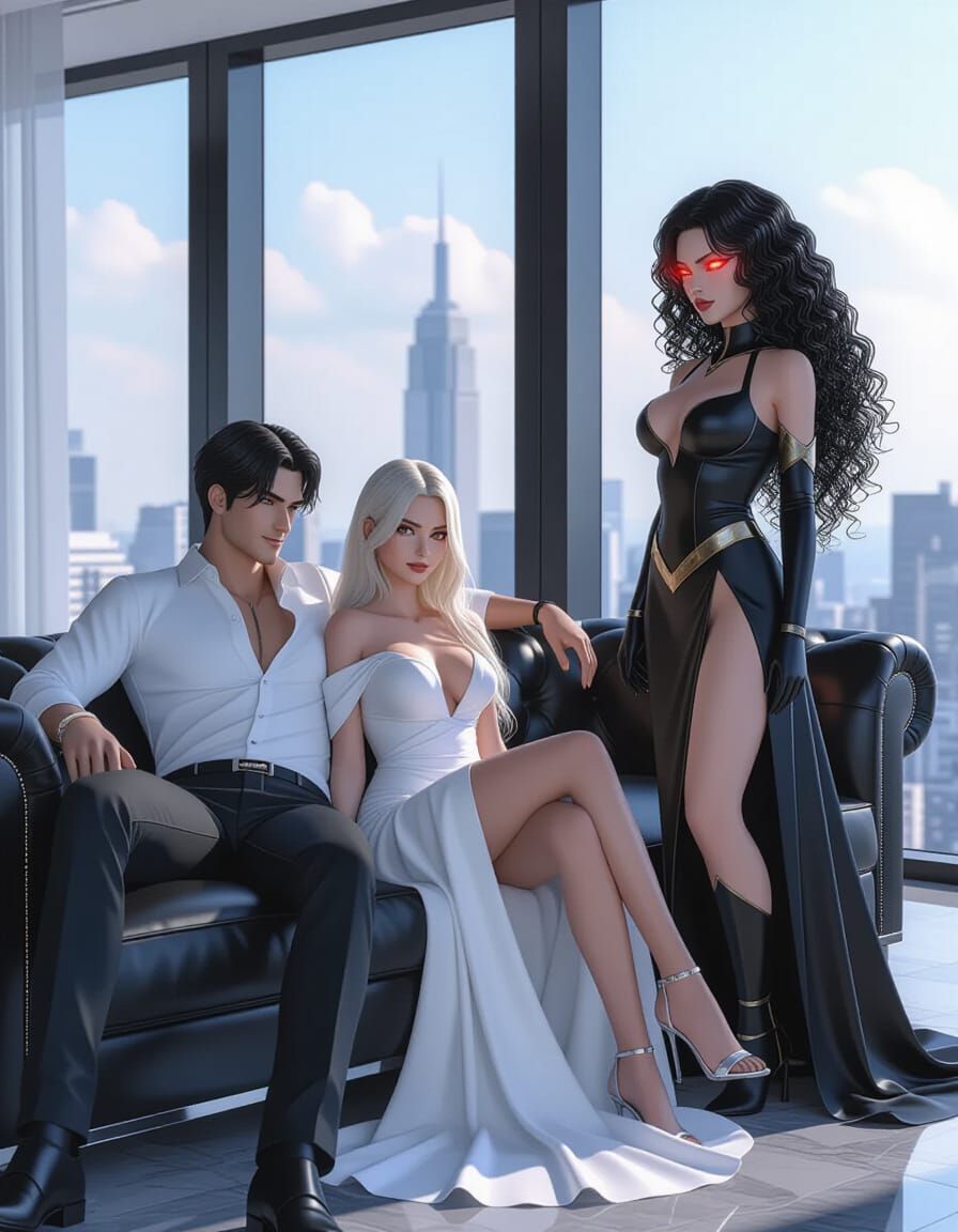 This image shows a man and woman relaxing in a penthouse. A costumed woman with glowing red eyes looks on in horror. Rendered in a detailed 3D anime style.