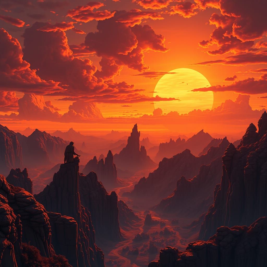 A vibrant image of an orange sunset over a dramatic landscape. The piece features intricate details and fantastical elements, rendered as a detailed matte painting with art deco patterns.