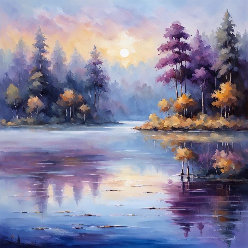 A serene landscape painting of morning mist rising above a tranquil lake at dawn. The impressionistic artwork is rendered with soft brushstrokes and a soothing color palette, creating a peaceful atmosphere.
