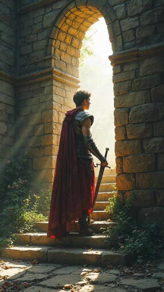 A young prince, determined and wounded, stands before a mystical tower, his gaze fixed on the door as he holds a worn sword. Soft golden light spills from above, casting an ethereal glow on the scene, reminiscent of Pre-Raphaelite romanticism and fairy tale illustrations.