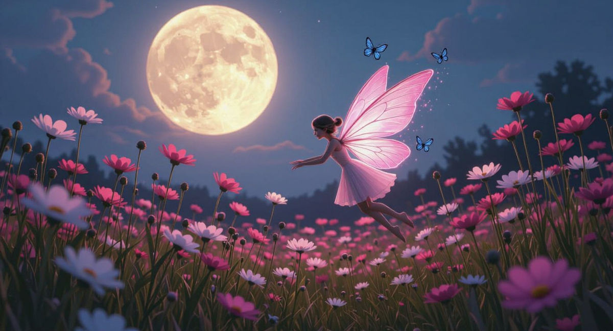 A pink bioluminescent fairy hovers over a field of pink and white flowers under a bright full moon, creating a magical, glowing scene.