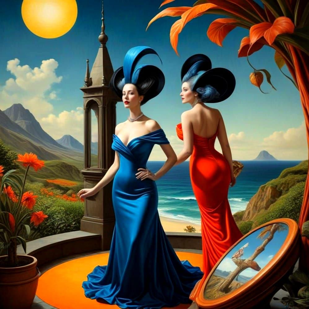 highly expressive full-height photographic portrait of exquisitely beautiful cheerful mature ladies, natural healthy face color, natural dynamic posture, sophisticated extravagant flamboyant outfits, highly detailed precise image, textured surfaces, intense vibrant colors, saturated luminous colors, ...
