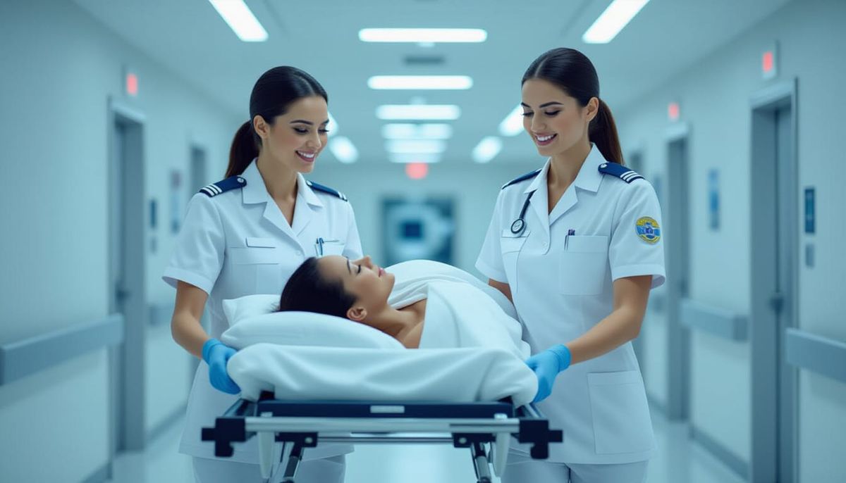 This photorealistic image shows two female paramedics carrying a woman on a stretcher down a sterile, modern hospital corridor. Captured with cinematic lighting and a shallow depth of field.
