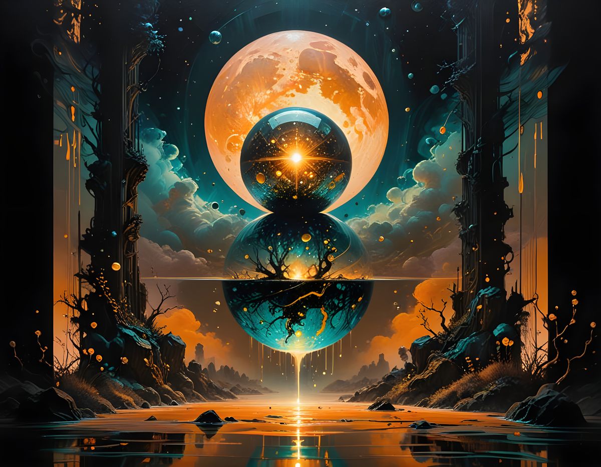 This piece of visionary art depicts the alchemical union of opposites, symbolizing the hermetic principle of "as above, so below." It captures a cosmic resonance of balance and duality, where the terrestrial and celestial spheres meet to distill a singular point of light. This symbolic artwork explores themes of the absolute, consciousness, and the mirrored nature of reality, making it a powerful statement on metaphysical unity.