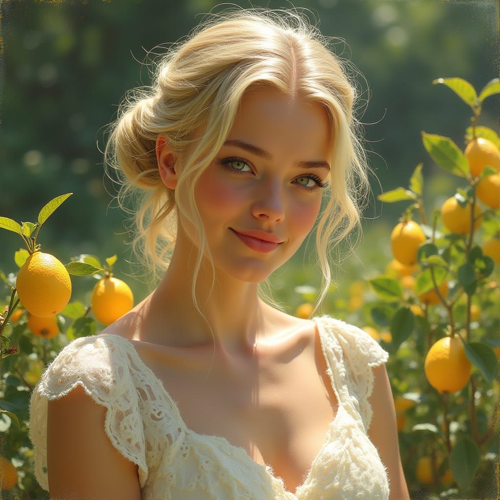 A sun-drenched image of a blonde woman in a lemon-patterned dress sitting in a blossoming garden. The artwork evokes impressionistic painting techniques with soft light and delicate details.