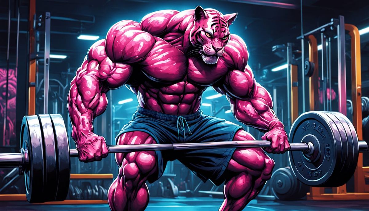 A dynamic, hyper-realistic image of a muscular pink panther lifting weights in a gym, surrounded by vibrant colors, neon lights, and high-tech equipment, showcasing its impressive strength and sleek, glossy fur.