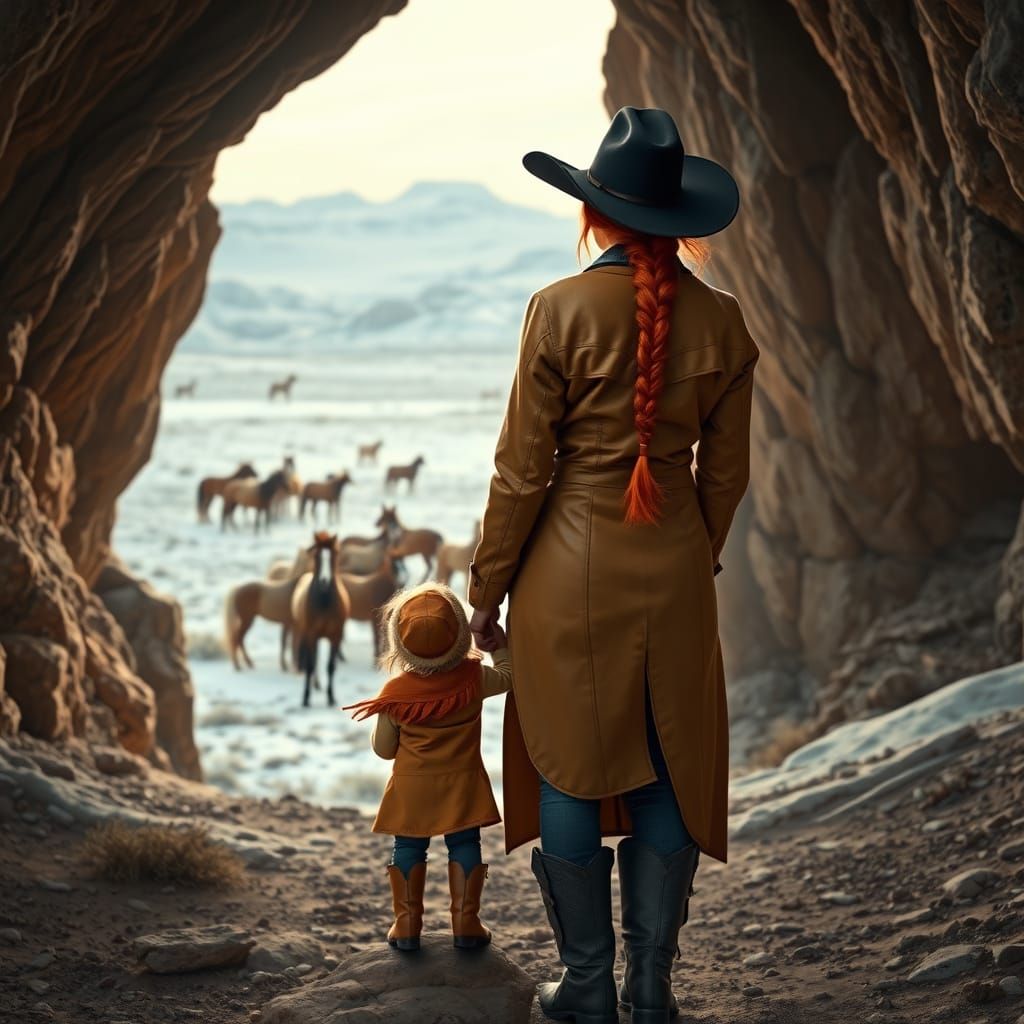 This image shows a mother and daughter silhouetted in a cave entrance. They are gazing at horses grazing in a snow-covered desert. The style blends rustic realism with cinematic lighting.