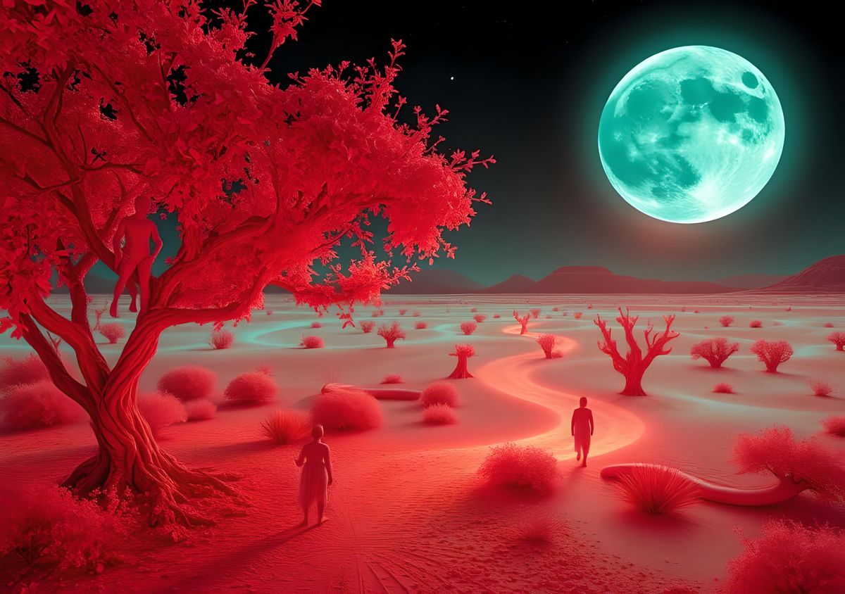A wide-angle, highly detailed image depicting an extraterrestrial Adam and Eve. Bathed in infrared light, they pick fruit in a phosphorescent desert beneath a large moon, as 3D rendered digital art.