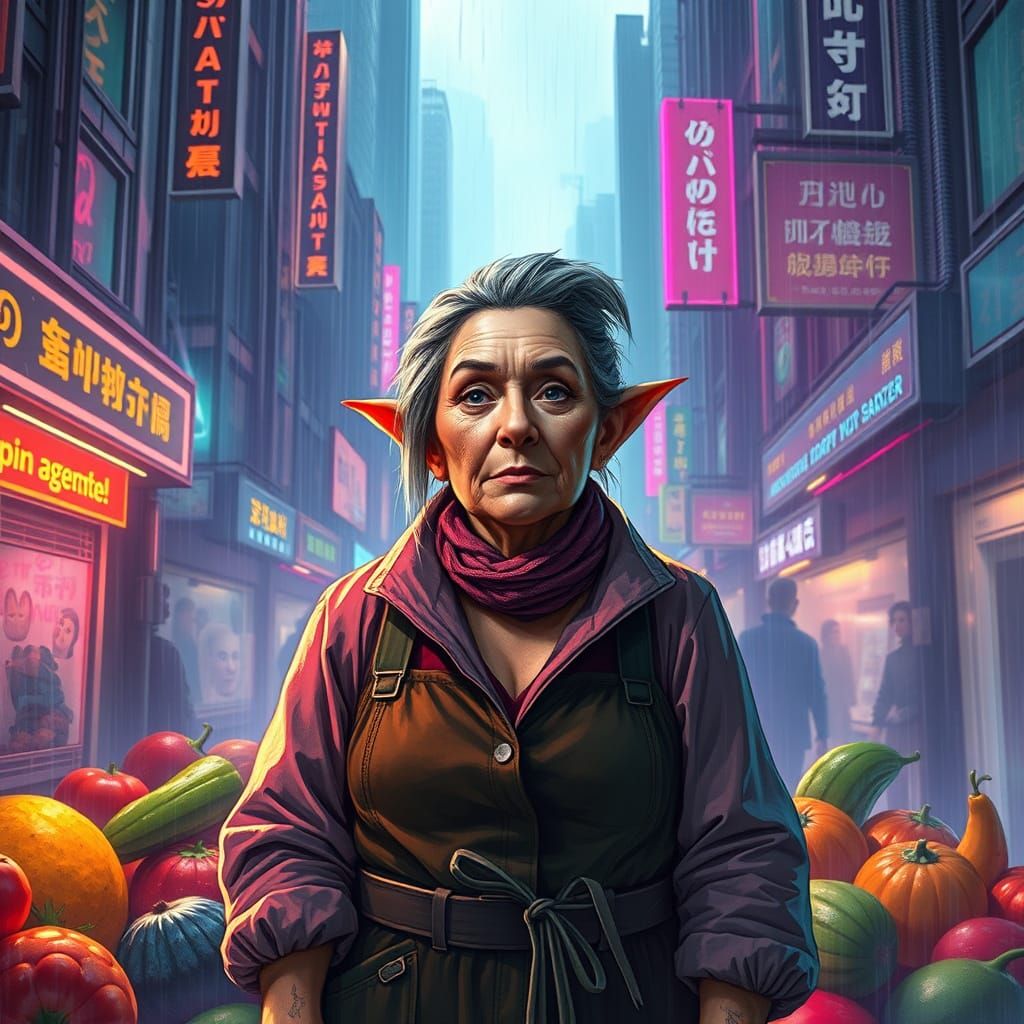 A striking portrait of a mature female halfling in a neon-lit city, surrounded by glowing, mutated foods, amidst a rain-soaked, high-tech atmosphere with mystical undertones