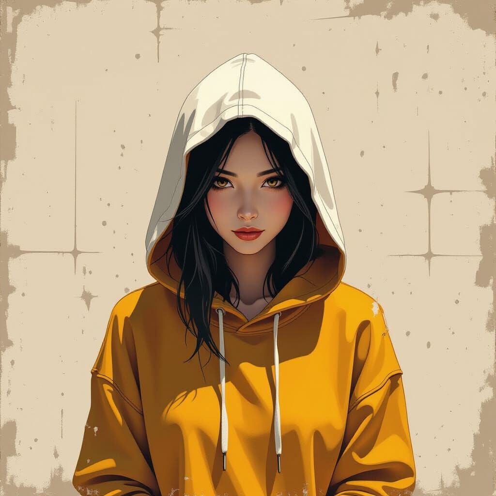 This image depicts a geisha in a raven hoodie, rendered with rough brush strokes on a dusty vintage canvas. The style blends minimalism and expressionism with a mustard and white palette.