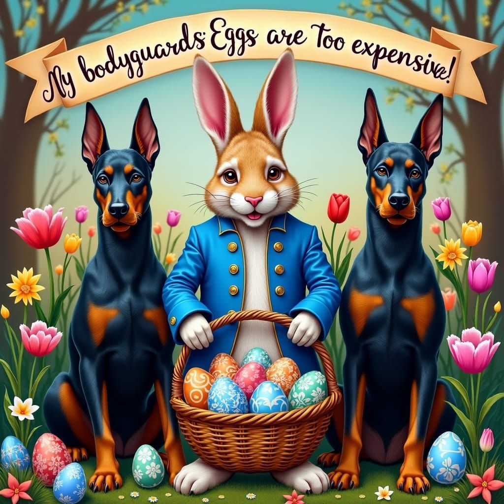 This image features a majestic Easter Bunny surrounded by blooming flowers and two sleek Doberman Pinschers, cradling a wicker basket of intricately decorated Easter eggs. Rendered in the style of Alcohol Ink art, the scene is full of vibrant colors and subtle texture, inviting the viewer to explore ever...