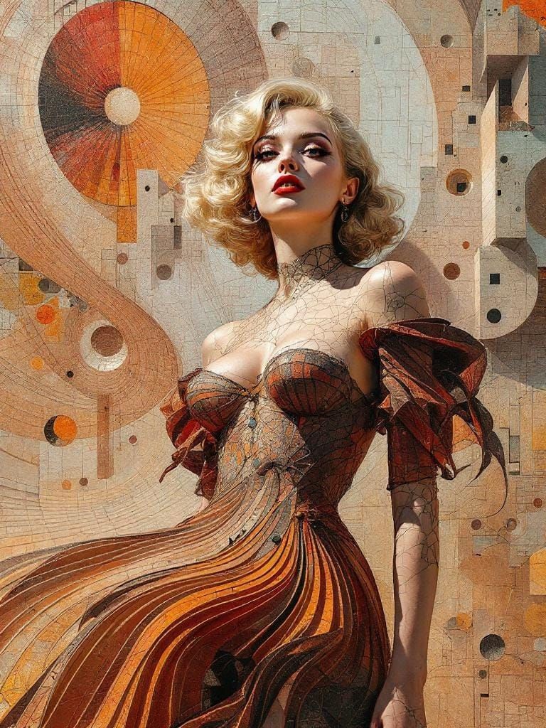 This image shows a 1950s pin-up woman. The image blends intricate textures and geometric patterns with dramatic lighting effects, creating a surreal, unsettling, and visually impactful scene.
