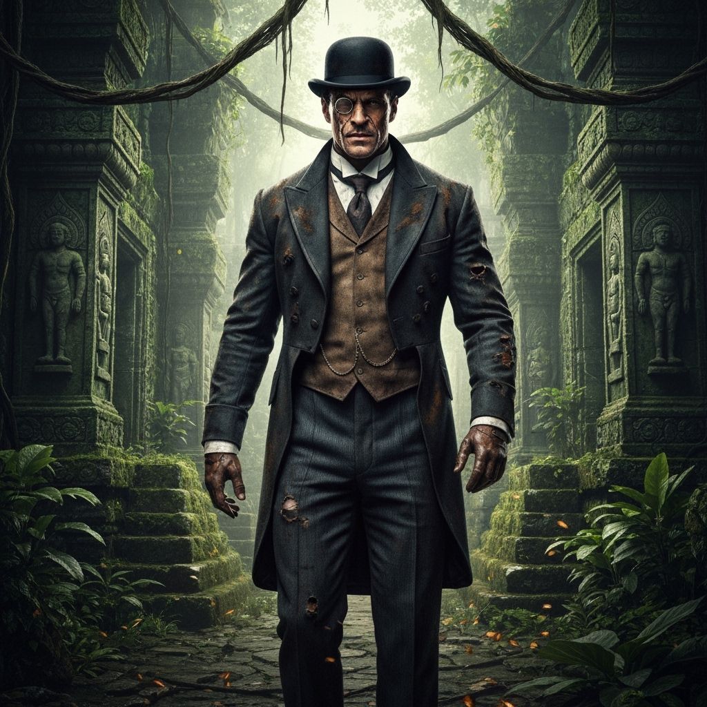 This image shows a sepia photograph of an Edwardian explorer in a torn suit discovering a hidden temple. The scene is set in a misty, overgrown jungle and evokes a vintage aesthetic.