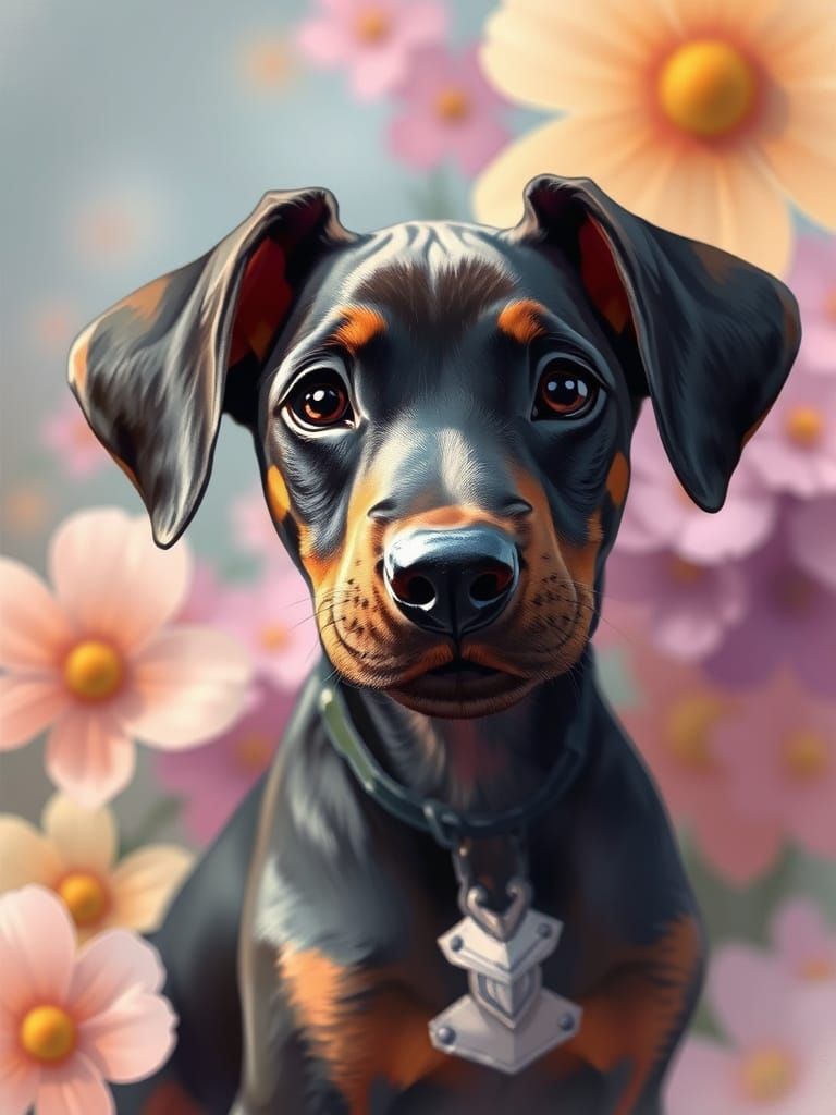 This image shows an adorable Doberman puppy with floppy ears in a vibrant floral spring setting. The artwork has a smooth, sharp focus, and is reminiscent of digital painting and concept art.
