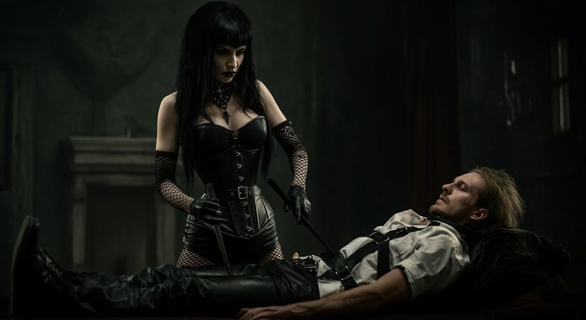 This image shows a woman in a leather corset and fishnet outfit disciplining a submissive man. Hyperrealistic details, cinematic lighting, and a moody atmosphere create a dark aesthetic.
