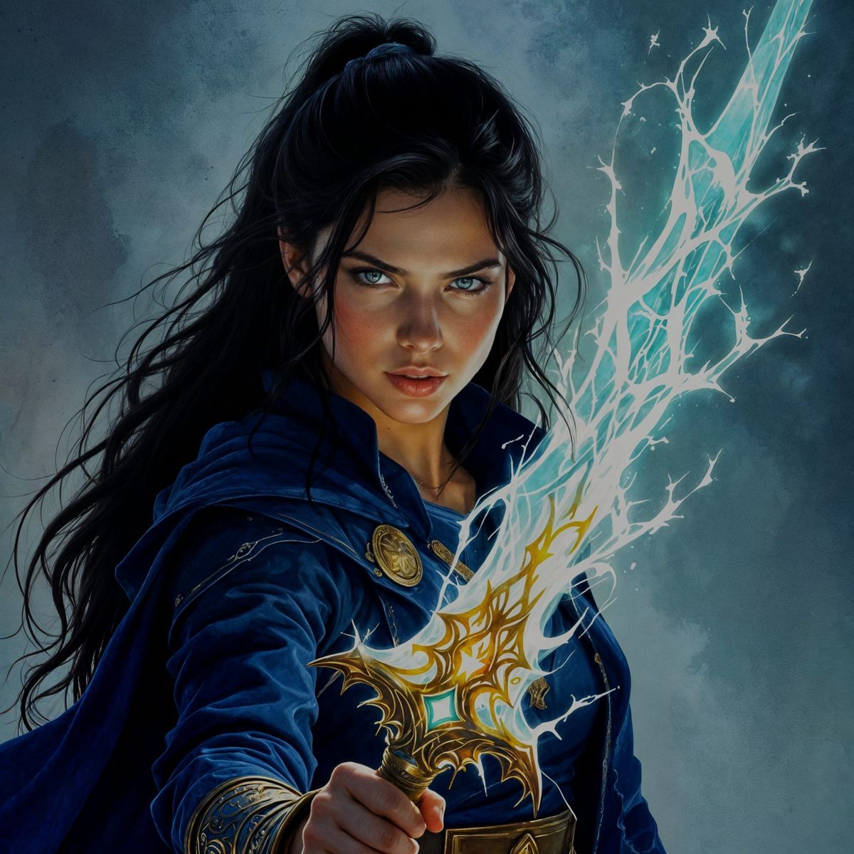 This image shows a determined woman holding a glowing, intricate magical weapon. Dramatic lighting highlights her resilience in a dark fantasy world with swirling watercolor textures.