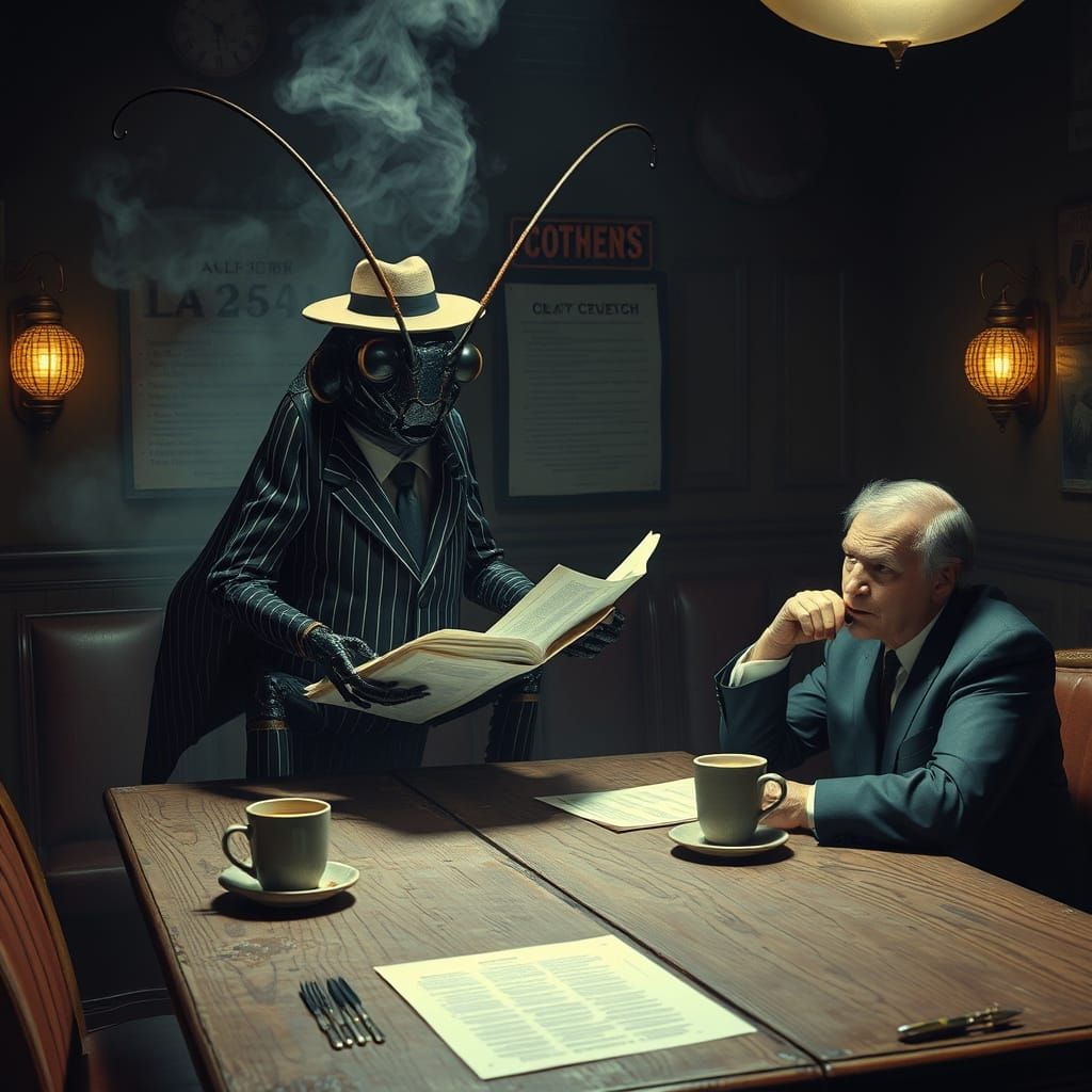 A tense scene unfolds in a smoky diner backroom, featuring a giant cockroach lawyer in a pinstripe suit explaining alien law to a nervous human agent over coffee. The image has a film noir aesthetic.