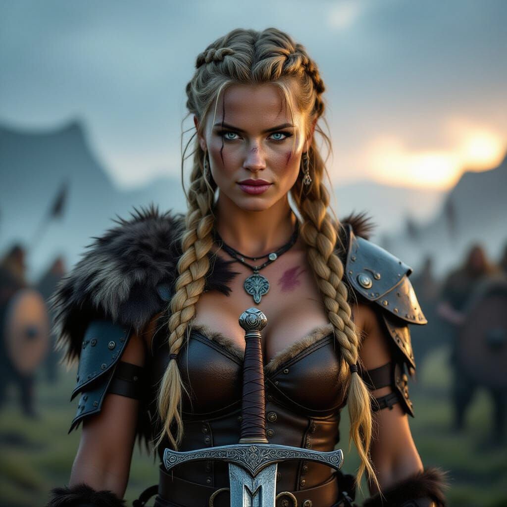 A striking picture of a Viking queen with braided blonde hair and icy blue eyes. She wears leather armor and holds a sword on a misty battlefield under a stormy sky, rendered with dramatic lighting.