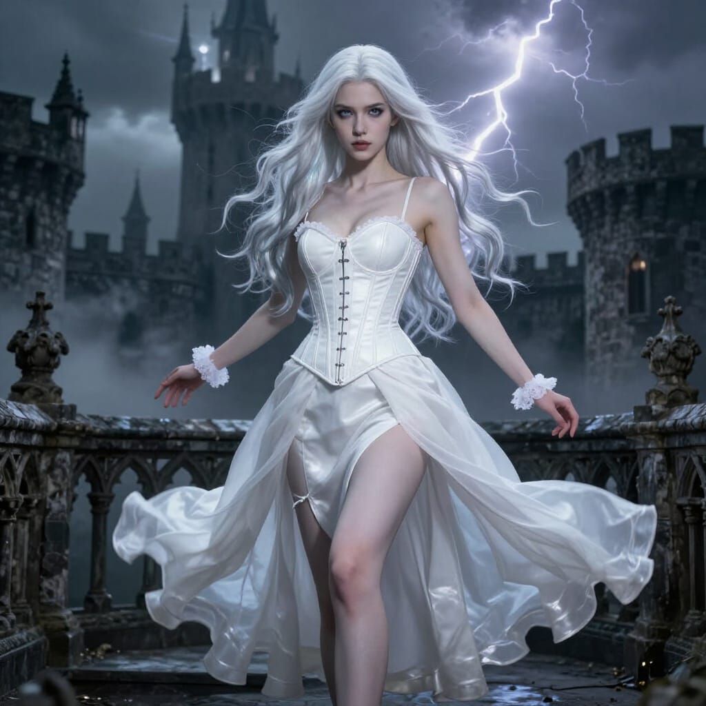 This image showcases a determined woman with pale skin and white hair on a gothic castle terrace. Stormy skies and lightning create a dramatic, dark elegant atmosphere.