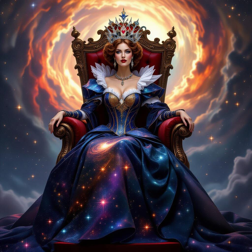 A queen of hearts depicted as a celestial empress on a throne of stardust. Her gown shimmers with galactic colors, crowned by constellations, set against a cosmic vortex. Presented with dramatic lighting and rich detail.