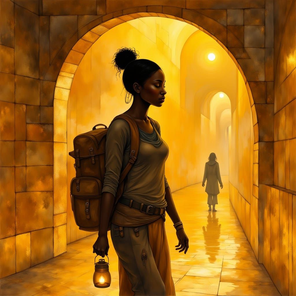 A striking picture of a Black woman walking through a golden tunnel, holding a lantern. The image features warm lighting and reflective textures, in a mystical realism aesthetic.