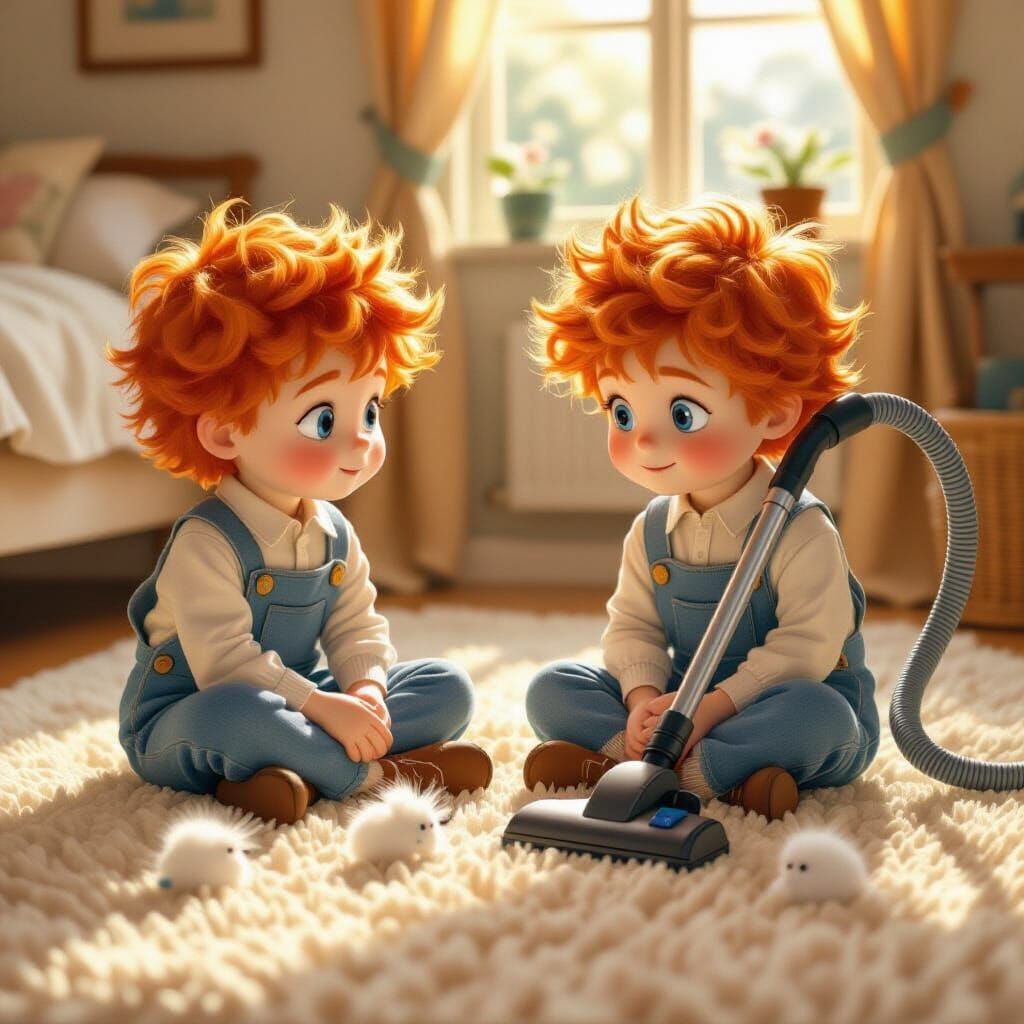 A charming image of a redheaded boy with blue eyes observing a whimsical battle between dust bunnies and a vacuum cleaner, rendered in a storybook illustration style.