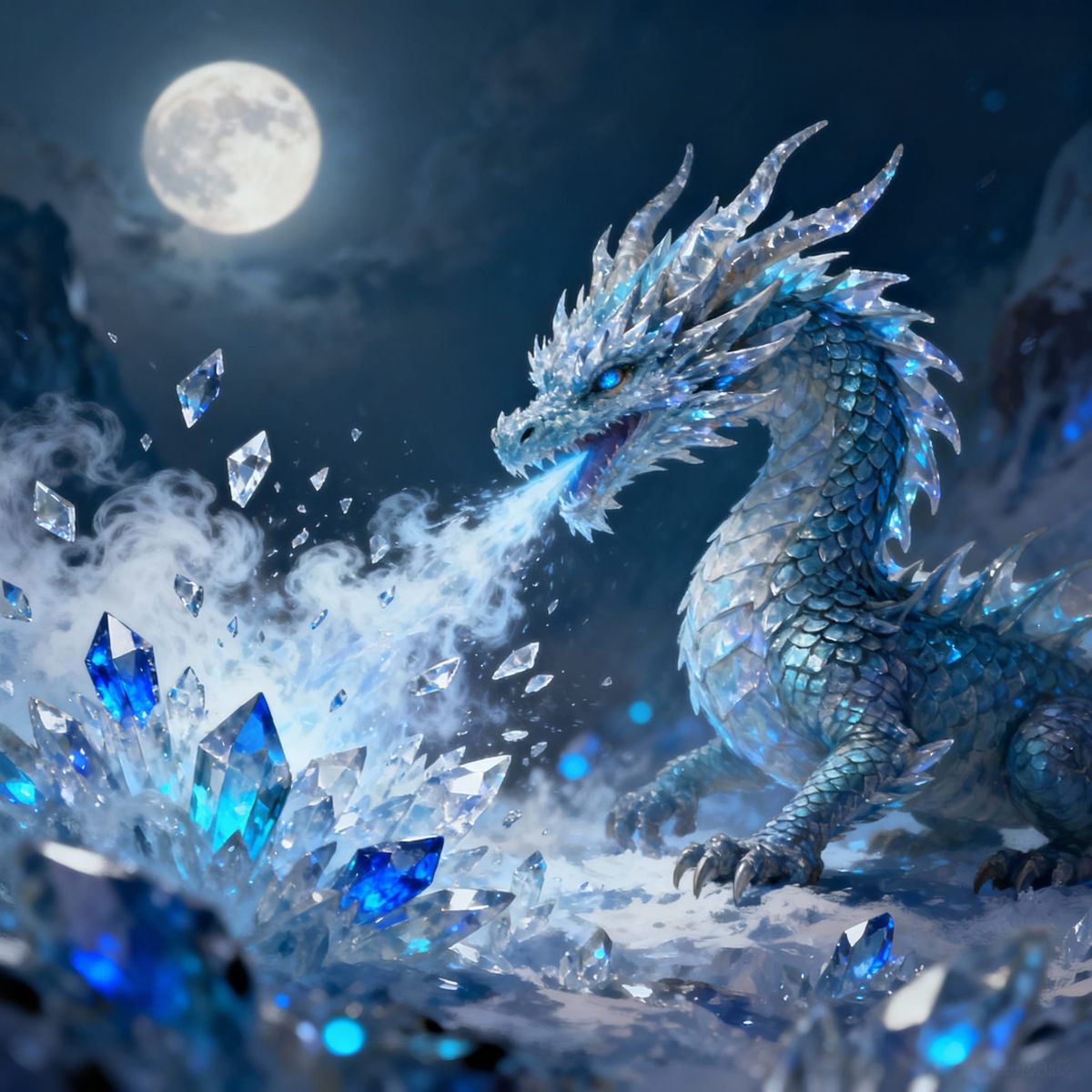 This image showcases a detailed digital painting of a tiny ice dragon breathing a realistic stream of ice. Ethereal moonlight illuminates crystalline details and icy mist.