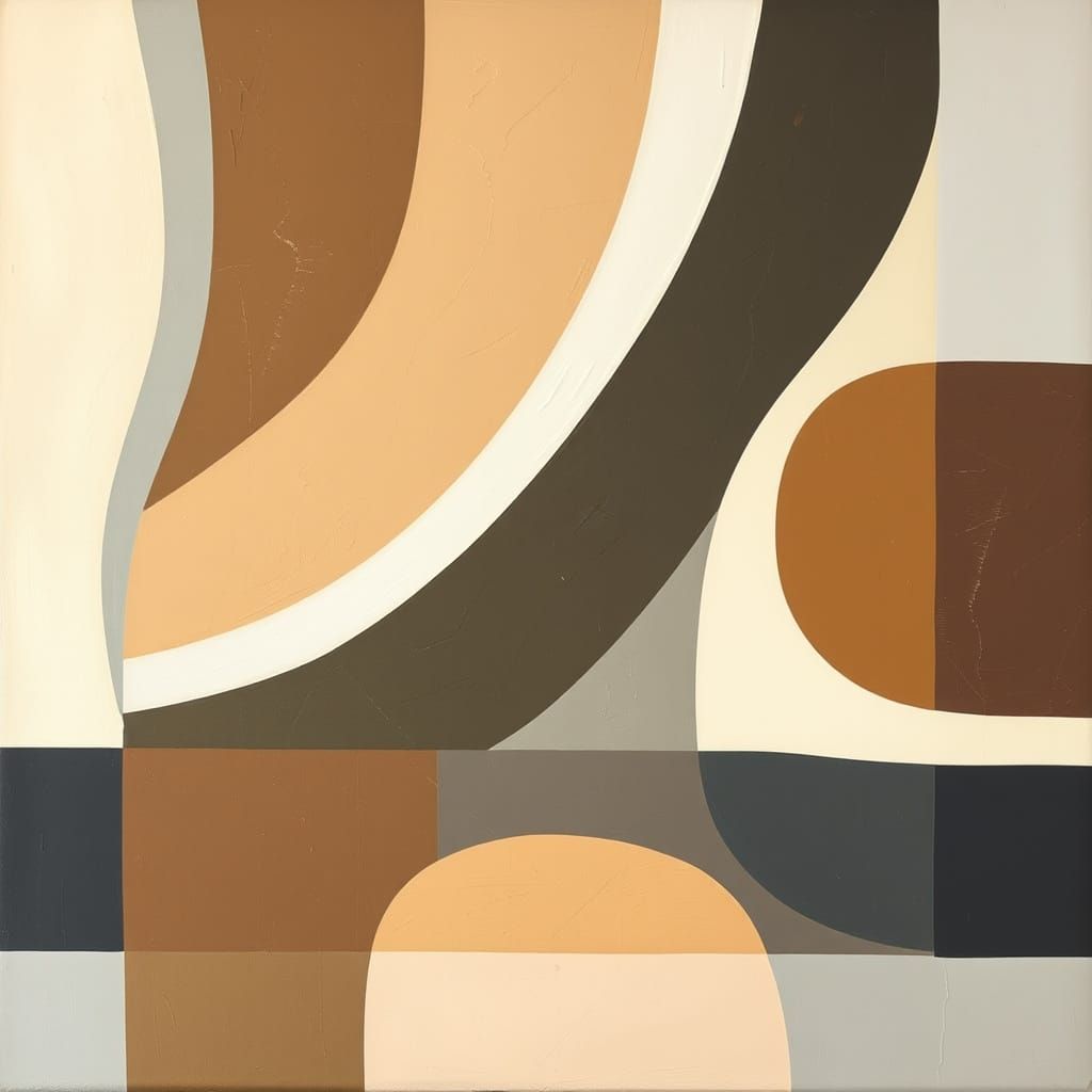 A modern acrylic abstract of overlapping geometric shapes. The color palette consists of neutral browns with neon accents, reminiscent of James Gurney's oil paintings.