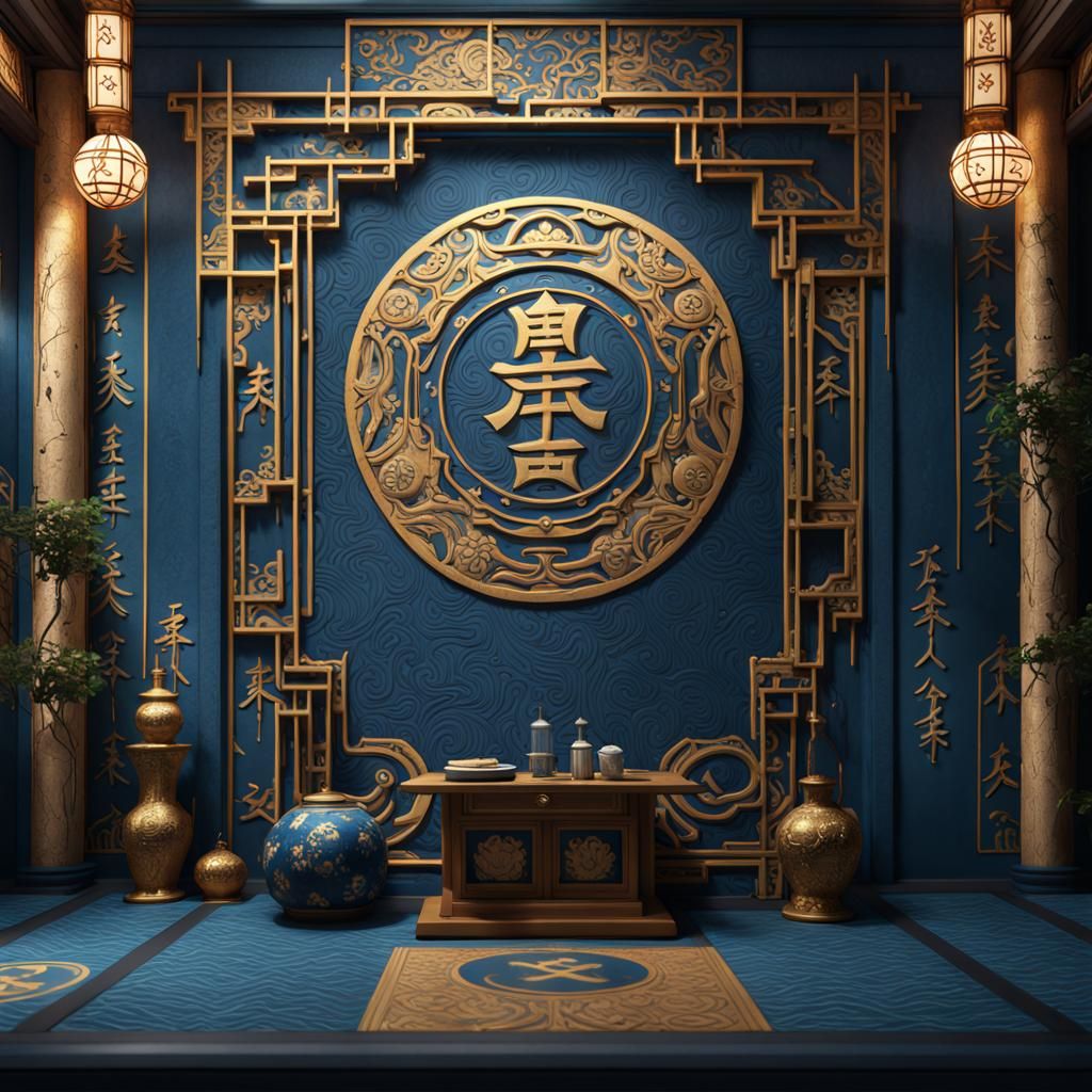 This image shows a blue Japanese temple wall featuring the golden Reiki symbol CHO-KU-REI. The detailed matte painting, rendered in deep and complementary colors, evokes fantasy concept art.