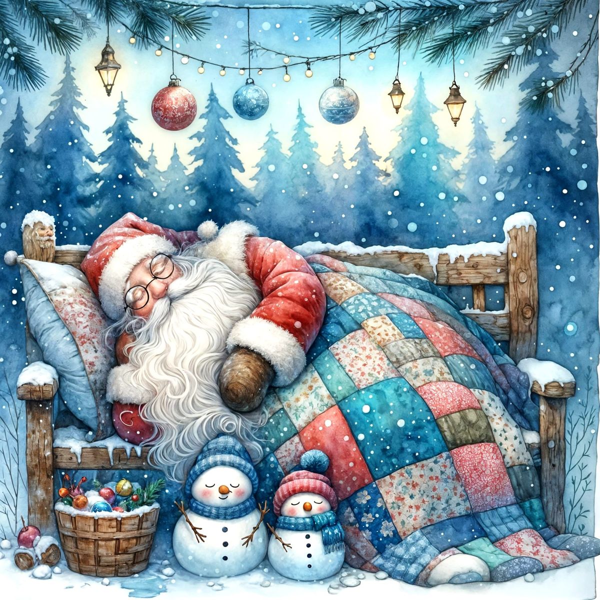 This charming watercolor illustration depicts Santa Claus sleeping on a bench with snowmen, surrounded by a peaceful winter forest scene. Features a soft pastel palette and dreamy storybook style.