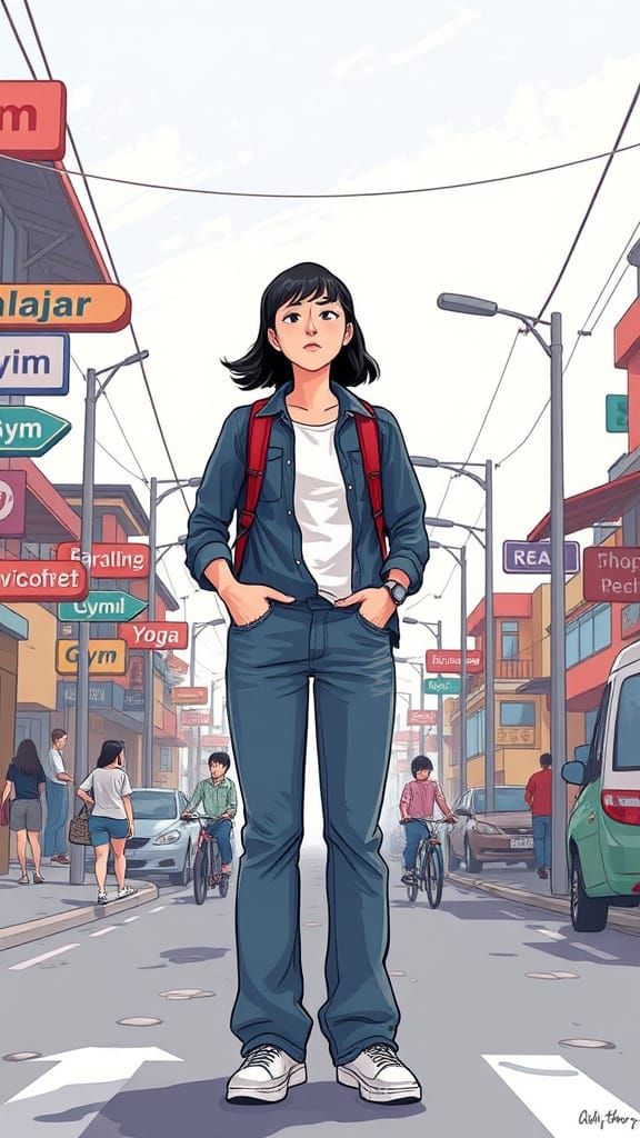 A person stands at a busy intersection with 24 diverging paths, each marked with life decisions. They look up, appearing lost, in a soft pastel illustration with smooth lines.